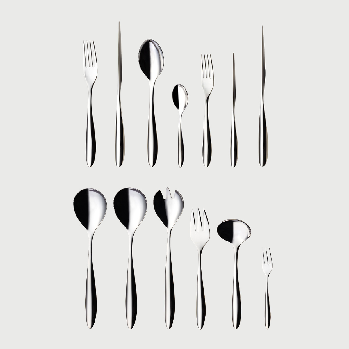 Lykke utmanar med sina flödande, böljande former och känns nästan levande när det ligger i handen. De tydliga linjerna ger besticken ett distinkt utseende, men samtidigt har de en enkelhet hos sig som gör att de anpassar sig till de flesta dukningar. Lykkevilar bra i handen – och glädjer ögat.