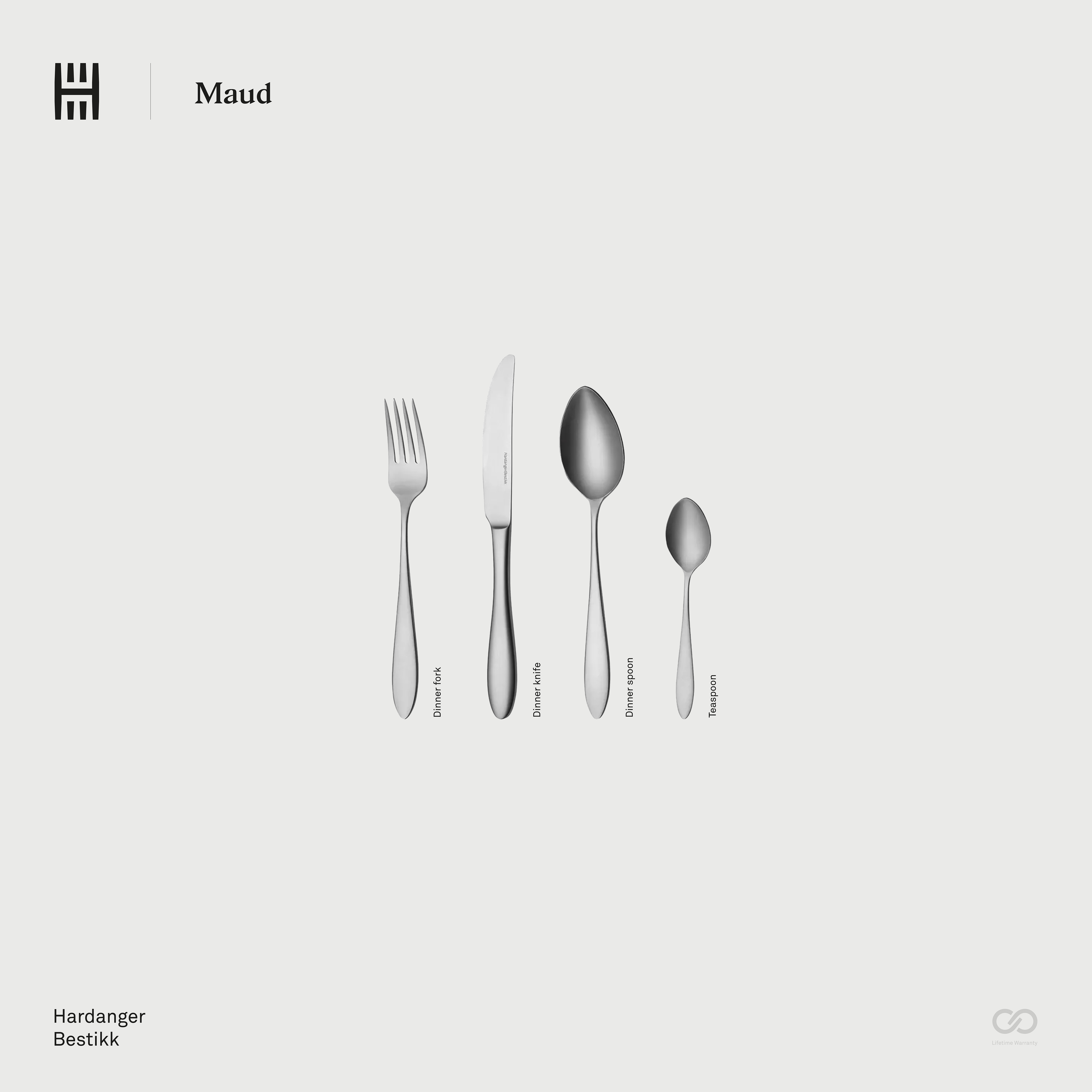 Maud – ett bestick som förenar exklusiv design med praktisk elegans. Med sin robusta och ärliga karaktär, lyser Maud i en subtil prakt genom sin rena och balanserade design. De konforma, men dämpade dragen höjer både den estetiska och taktila aspekten, därför är Maud ett förtroendeingivande bestick för varje måltid – från det vardagliga till det extraordinära.